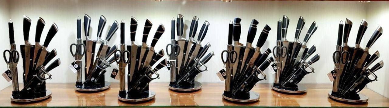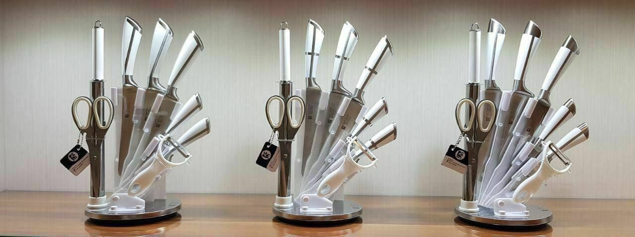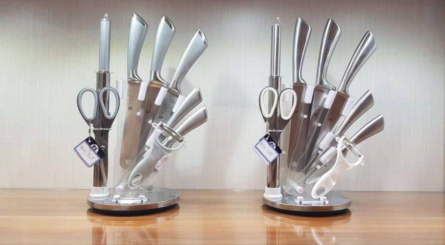 نه پارچه با پایه گردان ( چهار چاقو در چهار سایز به همراه ساطور ، چاقو تیزکن ، قیچی و پوست گیر )