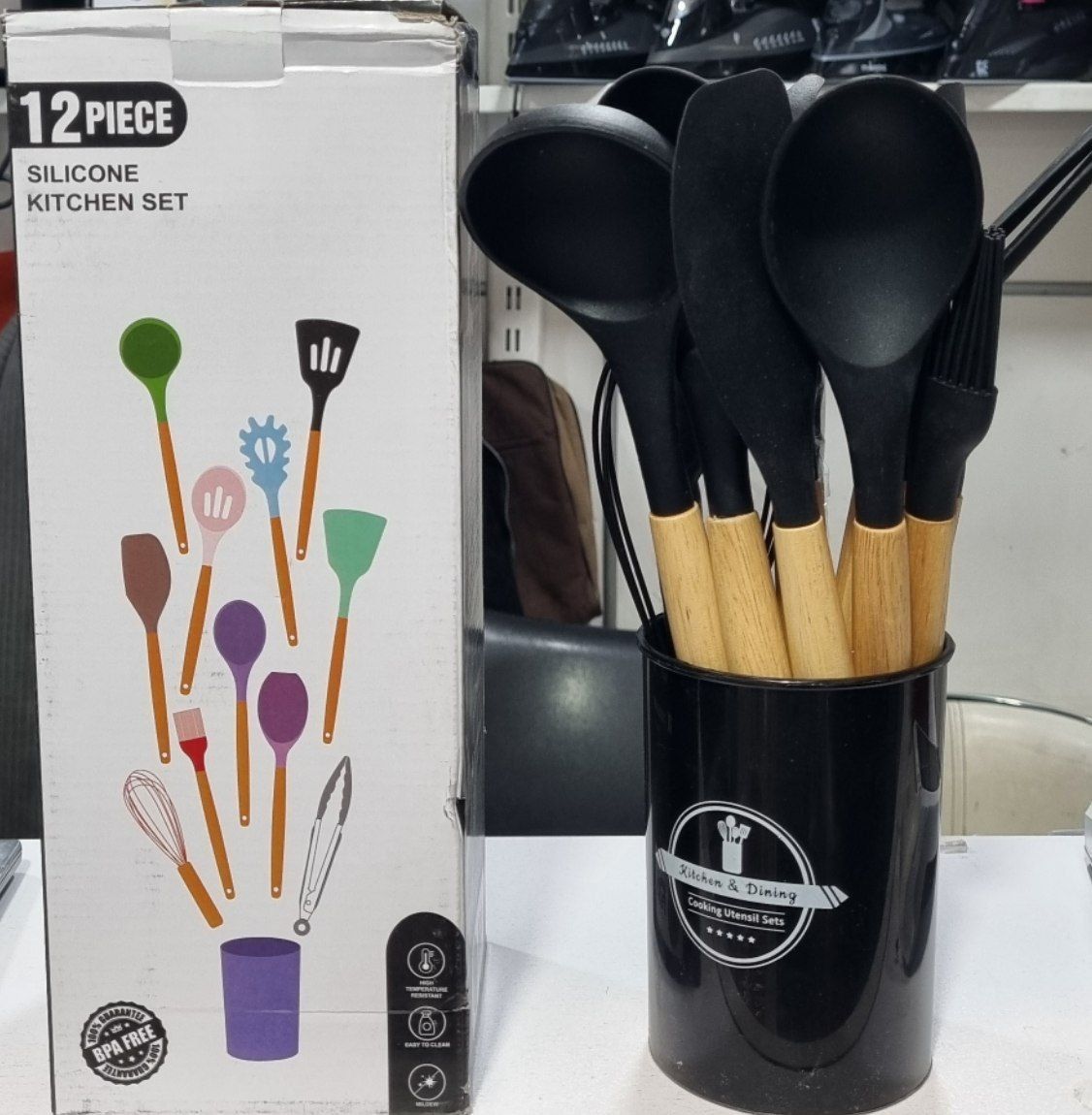۱۲ تیکه کامل دارای کفگیر و ملاقه های مختلف ، همزن ، انبر یخ و …